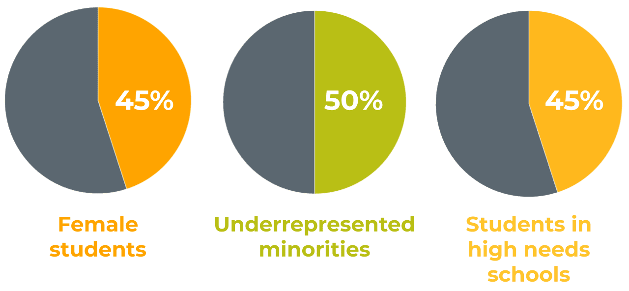 When we examine individual high schools, we see almost perfect racial representation in Code.org classrooms. Our end-to-end approach to diversity and equity helps to ensure the diversity of students in our CS classrooms roughly matches the diversity of their school population at large. While CS classes are traditionally dominated by white and Asian students, Code.org classrooms have almost balanced racial diversity.