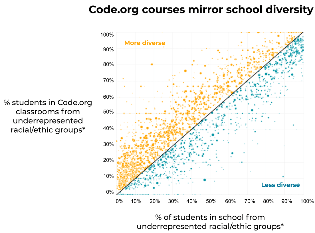 This is partly because teachers integrate Code.org into classrooms that are already diverse, and partly because we weave a focus on diversity across our work.